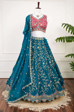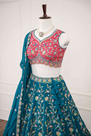 Teal & Pink Multicolor Embroidered Lehenga Set