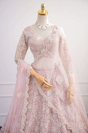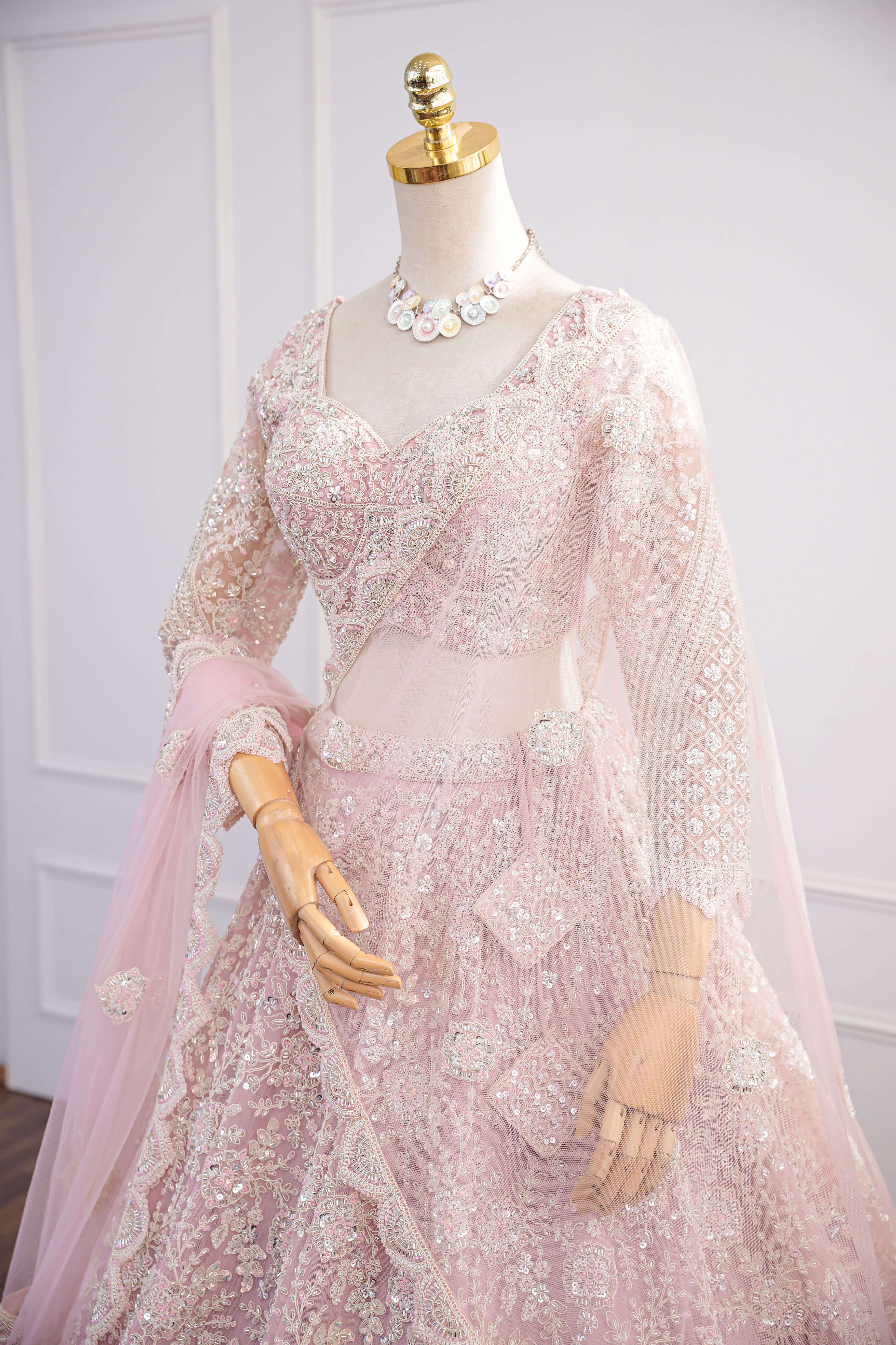 Blush Pink Net Lehenga with All-Over Elegant Embroidery