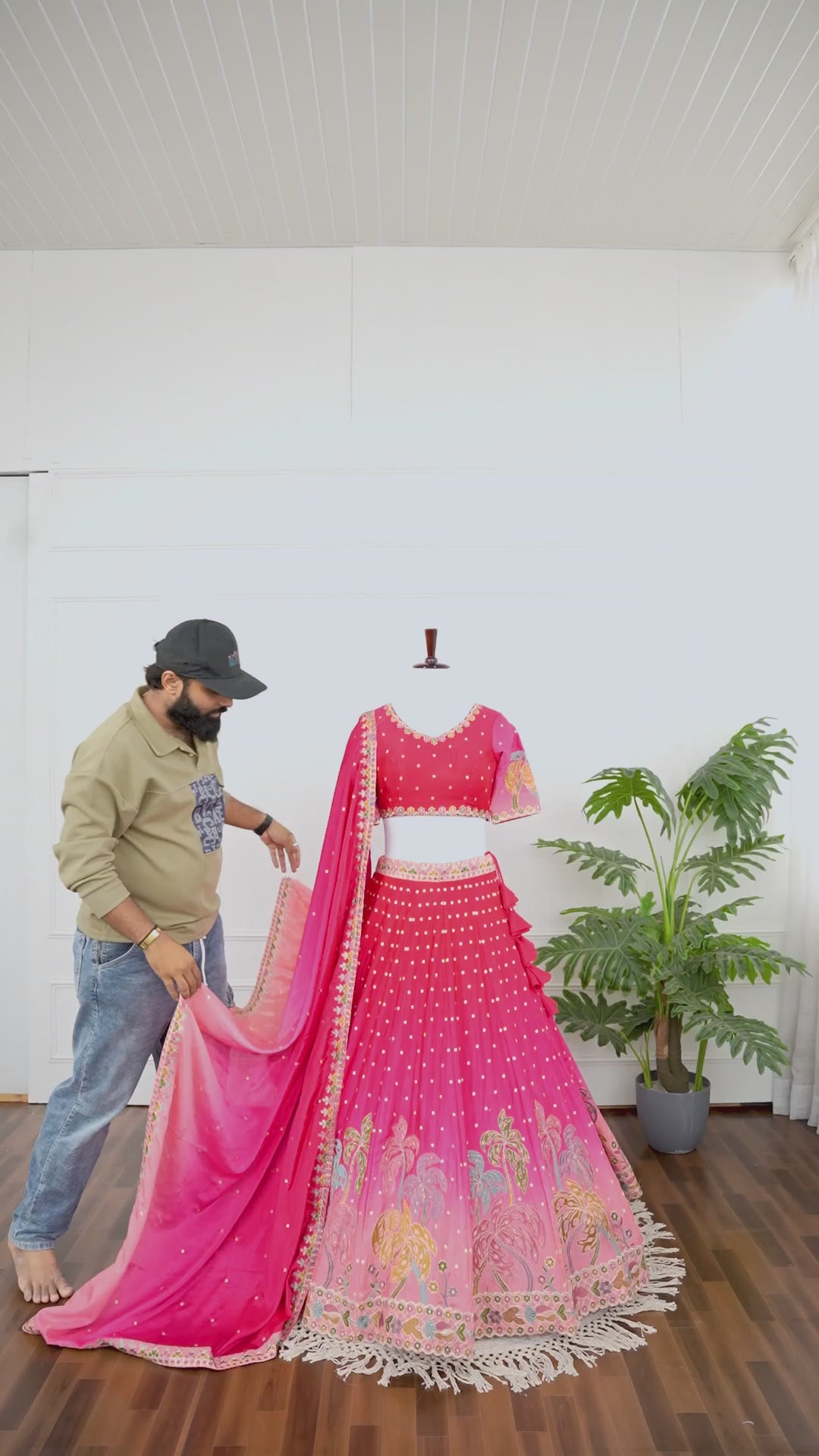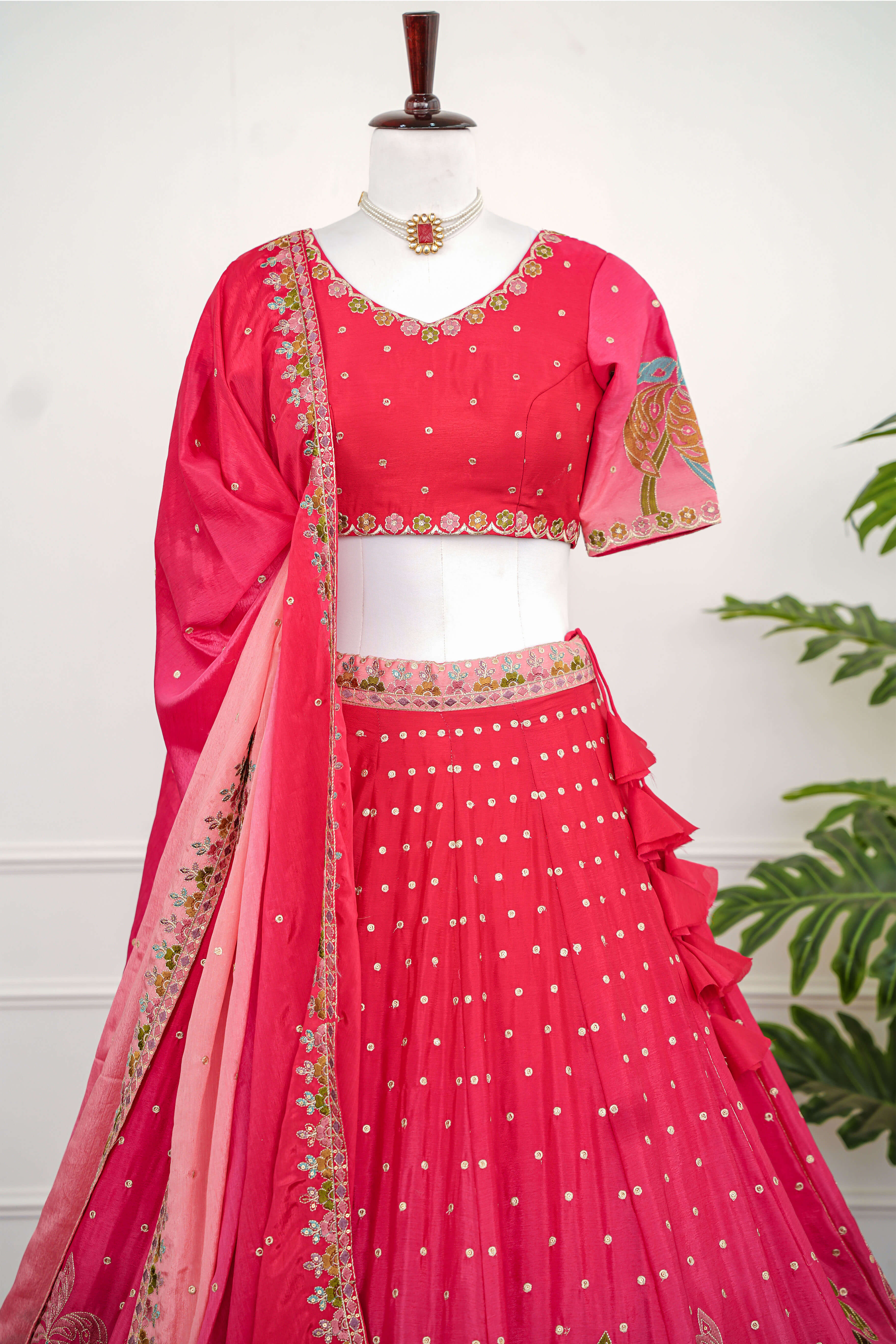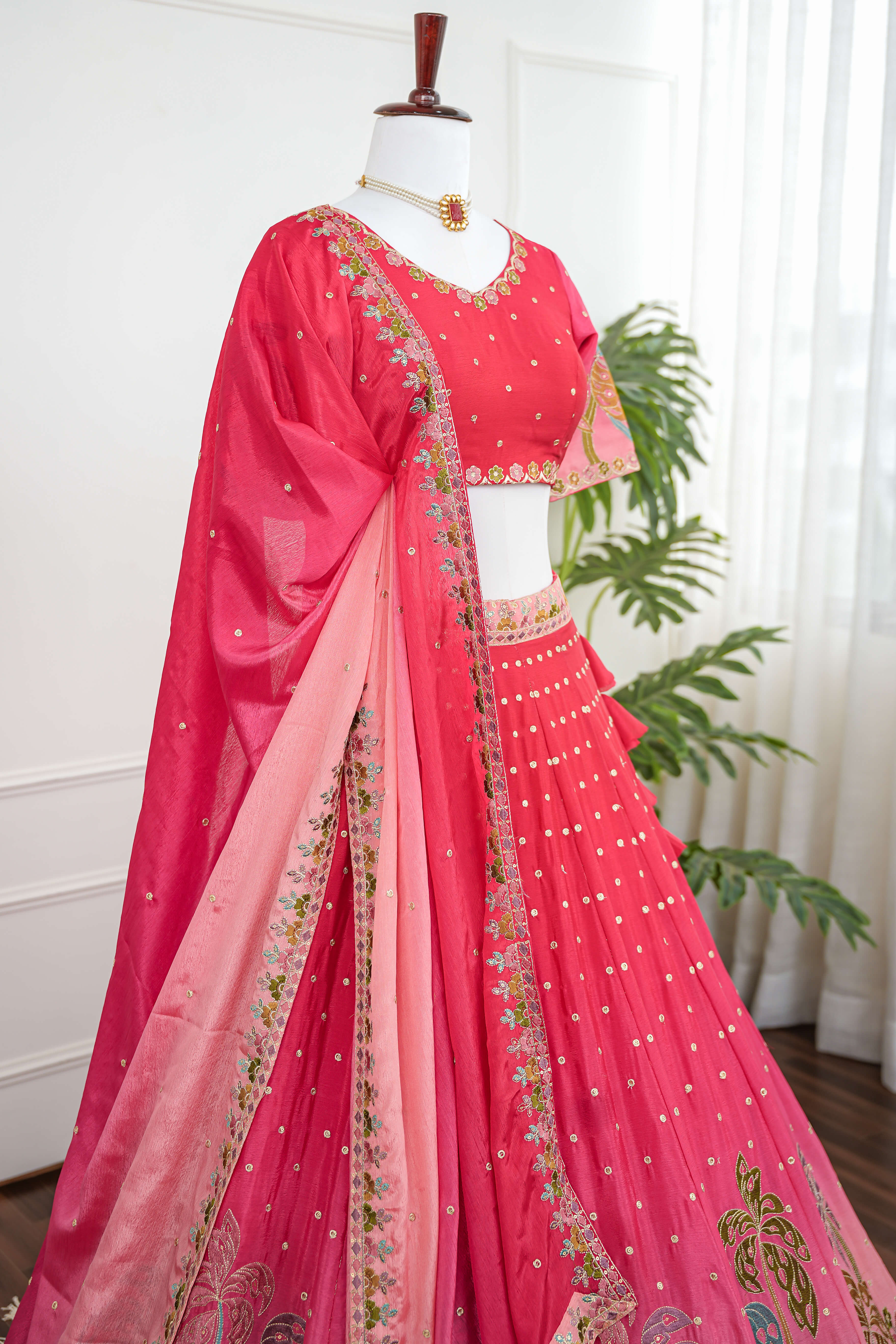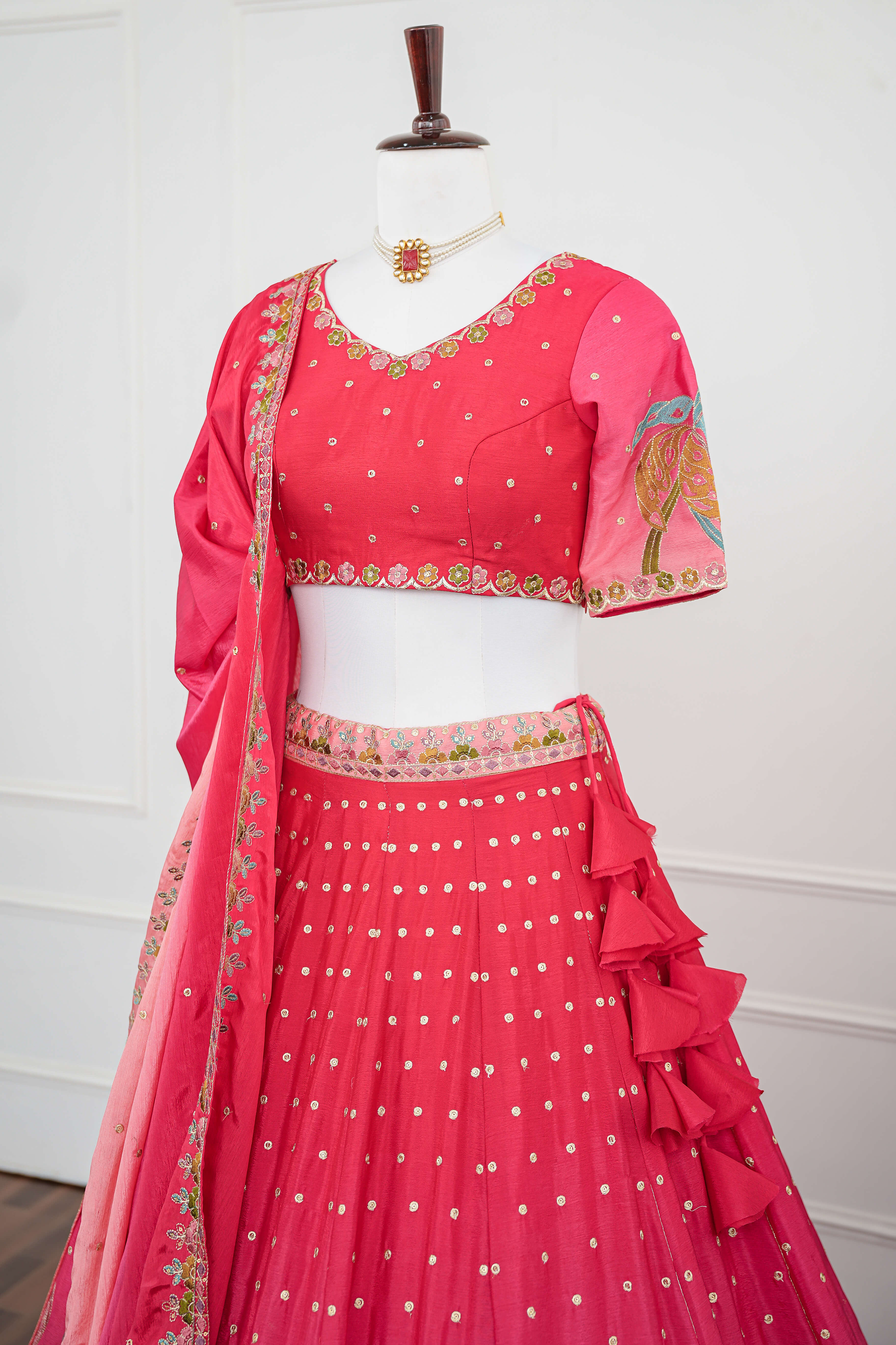 Ombre Pink Lehenga with Mirror and Peacock Motif Embroidery